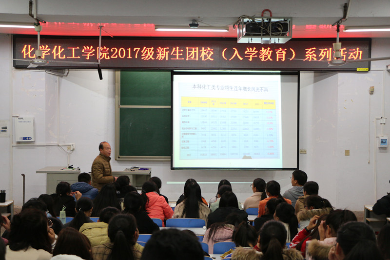 11月24日晚,新葡萄88805官网在教四T1举行2017级应用化学与化学工程与工艺专业思想教育活动。副院长归风铁担任主讲,本次活动由应用化学班班主任丁爱祥主持,两个专业的全体学生参加了本次活动。