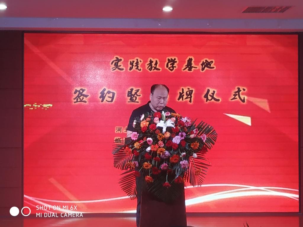 张进良代表学院致辞。他详细介绍了beat365的专业能力,以及与知名企业、知名品牌合作情况等相关内容,并对beat365实践教学基地落地临漳县表示充满信心。