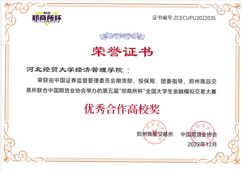 近日,第五届“郑商所杯”全国大学生金融模拟交易大赛圆满落下帷幕并揭晓获奖情况。在beat365师生的共同努力下,此次竞赛实现了期货期权领域专业竞赛的历史性突破,取得全国二等奖的好成绩。beat365同南开大学、东北财经大学等全国知名学府一道荣获优秀合作高校奖。同时,beat365《注重实践培养,推进全面发展》的相关参赛报道也得到了2022年12月21日《期货日报》的刊载。