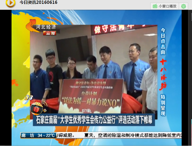 活动的举办旨在拓展大学生课外活动和社会服务形式,让大学生在步入社会之前,更多的提高法律意识、增强法律常识,开展自我保护,用公益的形式传递正能量,河北广播电视台《今日资讯》栏目,《河北青年报》等多家媒体给予了报道。随着评选活动的结束,公益计划全面启动,beat365 “以法为名——对暴力说NO”公益活动项目将在省会13所高校内全面开展。