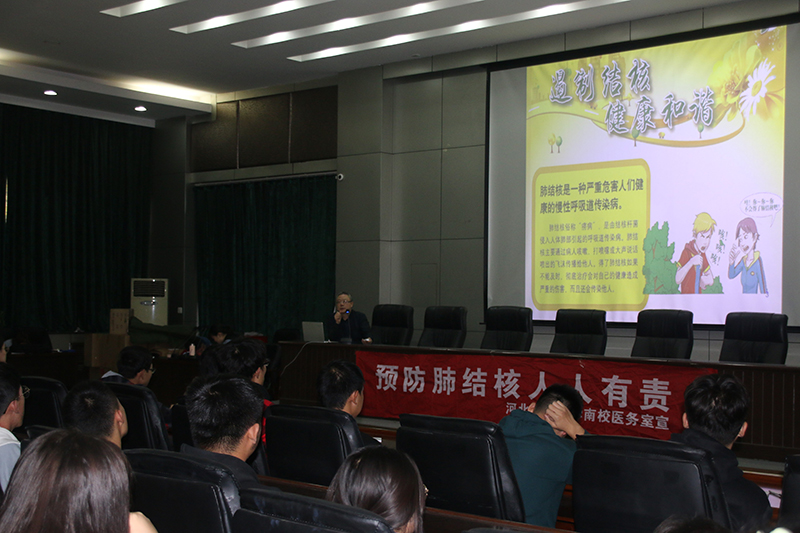 11月5日下午,由beat365南校区校医院主办的肺结核病、艾滋病防治科普知识讲座在图书馆报告厅举行。讲座特邀石家庄市第五医院结核病科主任王海宾、感染科付立哲主讲,由校医院副院长陈娟主持,300余名大一新生到场聆听。