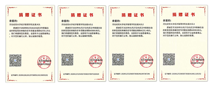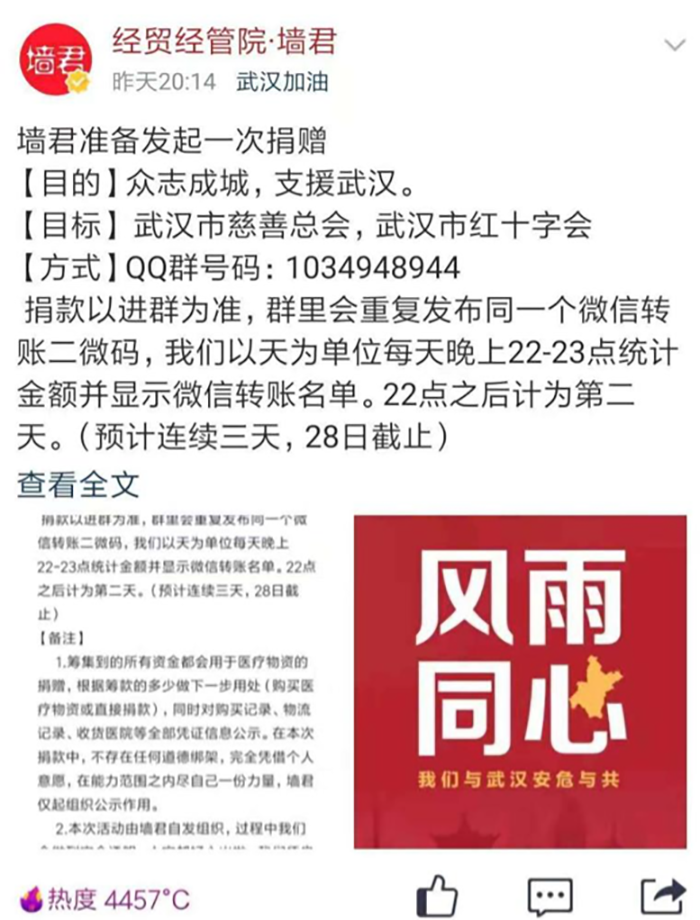 经管学子在参与防疫服务的同时,也不忘向武汉人民献上自己的爱心。信息系2016级学生陈文锁,也是QQ个人平台“经贸经管院·墙君”的负责人,1月25日他通过平台向经管学子发起捐款活动,短短50个小时,共有404人参与,募集到捐款1万元,在联系购买防疫物资未果后,陈文锁于第一时间将款项捐赠给武汉市慈善总会。事后他说:“疫情发生后,很想做点什么。这是我们90零后00后在这场战‘疫’中尽的一份力。”截至2月15日beat365共有902位学生通过各种途径捐款捐物,金额高达6万余元。