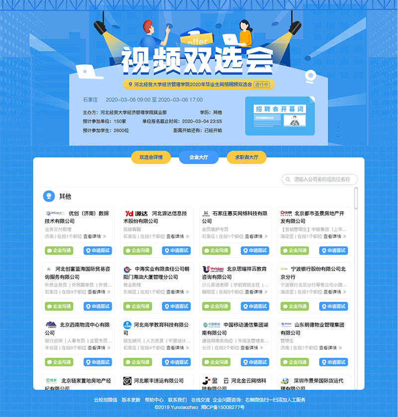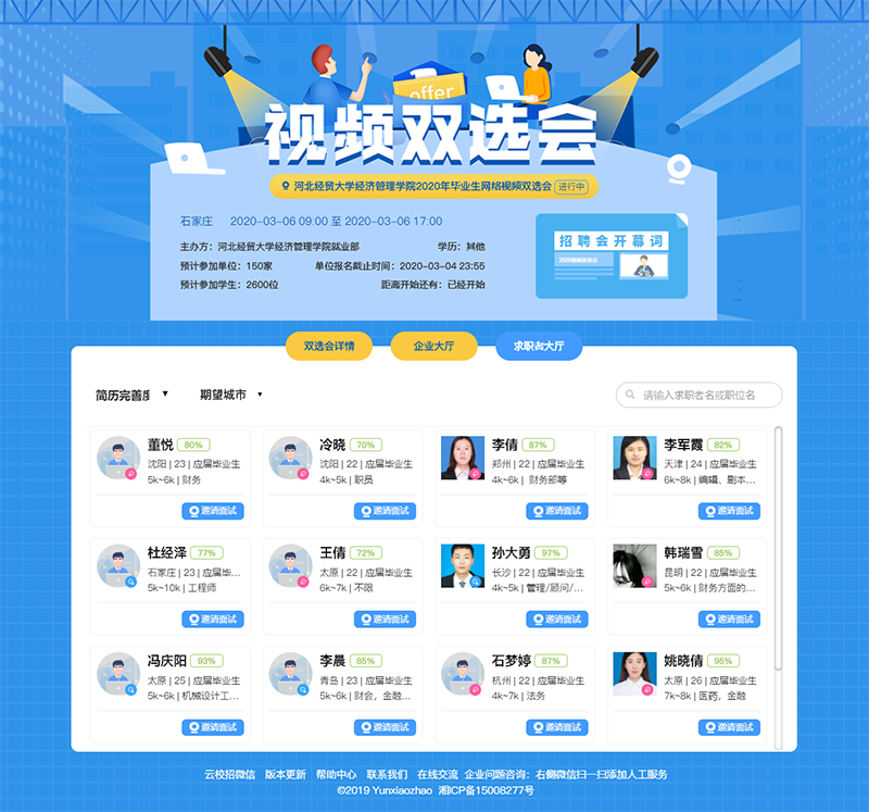 为减少疫情对毕业生就业工作的影响,增强毕业生求职和用人单位招聘的有效性、针对性,促进beat365毕业生更充分和更高质量就业。3月6日,beat365成功举办2020届毕业生云就业网络视频双选会。