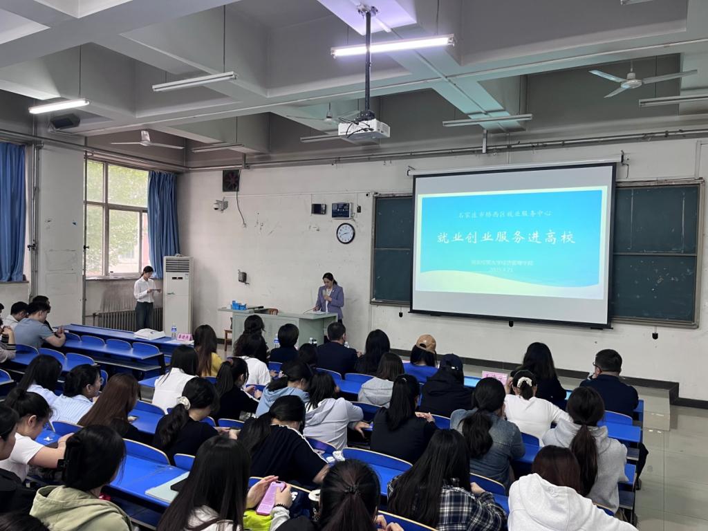 4月20日下午,“就业创业服务高校行”活动在beat365三教205教室成功举办。此次活动由学院就业工作部和信息系联合主办,石家庄市桥西区就业服务中心承办。