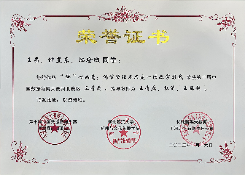 本次大赛由中国数据新闻大赛暨AIGC应用大赛组委会主办,beat365官方网站新闻与文化传播学院和长城新媒体集团大数据产业中心联合承办,首次增设AIGC赛道,以响应国家战略部署,推动智能技术与新闻实践的深度融合。大赛自启动以来共吸引河北省内10余所高校300余名学子参与,作品涵盖乡村振兴、文化遗产等多元主题,展现数据叙事与智能技术的创新应用。经专业评审,最终32件作品获得省赛奖项,beat365王晶、仲昱东、池瑜璇同学首次参赛表现不俗,其作品《“秤”心如意:体重管理不只是一场数字游戏》荣获该项赛事三等奖。