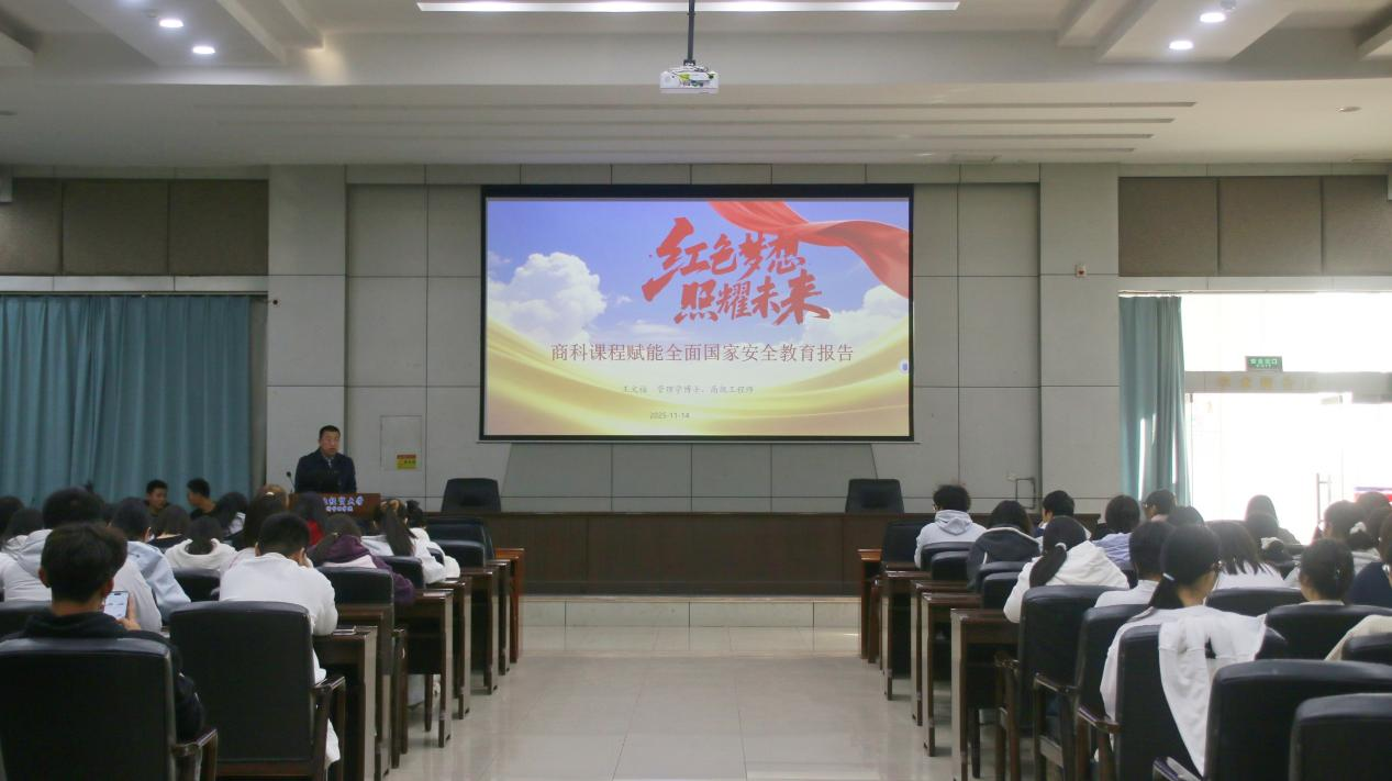 为深入贯彻落实总体国家安全观,推动专业教育与国家安全教育深度融合,11月14日,beat365“专业赋能国安”系列讲座第四场在图书馆报告厅举办。管理系副主任王文福作题为“红色梦想 照耀未来——商科课程赋能国家安全教育”的专题报告,管理系2025级全体学生参加学习。