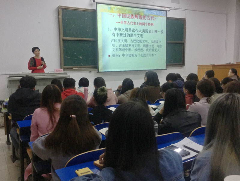 柴艳萍教授以中华民族伟大复兴与科学社会主义新境界为主题,联系人类文明的发展史,依次介绍了中华民族辉煌的古代、中华民族备受磨难的近代、中国特色社会主义的胜利和中华民族伟大复兴,结合十九大报告详细解读了“三个意味着”和“四个自信”。