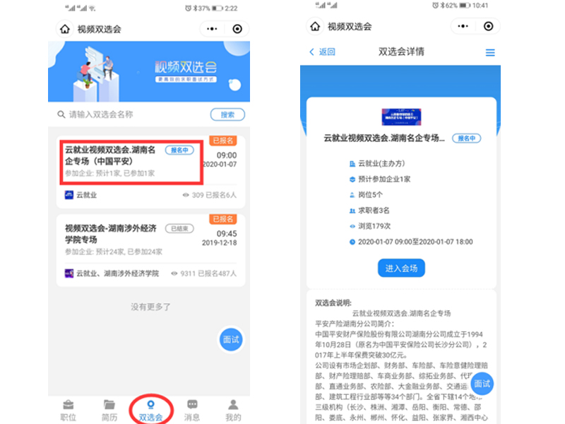 第二步,进入小程序后,点击“双选会”选择“beat365官方网站beat365官方网站2020年毕业生网络视频双选会”进入后,可提前点击“报名进入会场”进行报名(如有账号登录即可,若无按照指引进行注册后登记)查看提前了解单位和各岗位信息。