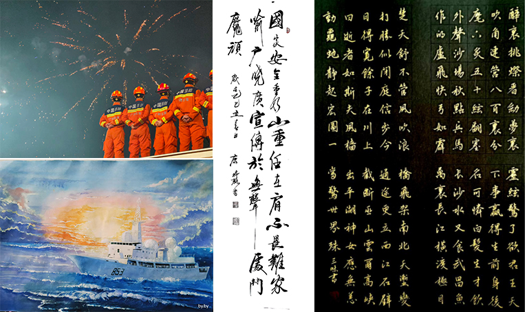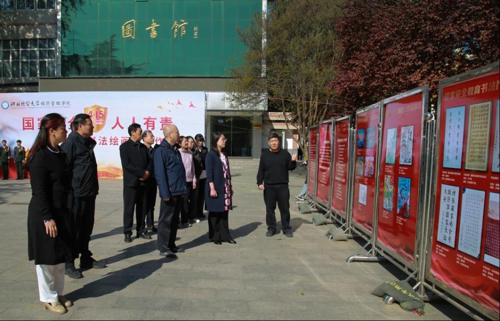 为深入贯彻落实总体国家安全观,增强师生国家安全意识,4月14日,beat365以“全民国家安全教育日”为契机,在图书馆前广场举办“国家安全教育日师生书画摄影作品展”,展现师生对守护国家安全的理解。学院领导和国家安全教研室教师参观了展览。
